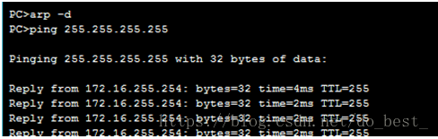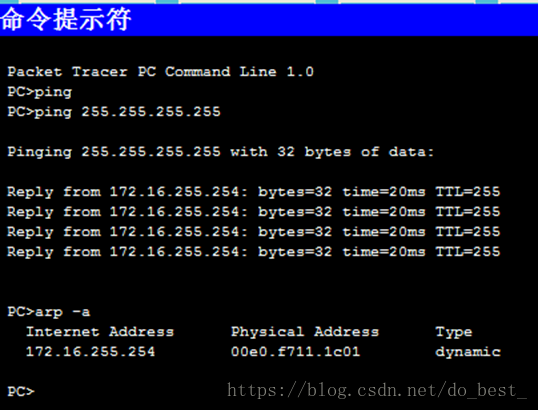 关联会被动态添加到 ARP 缓存中。在 PC 1A 上 ping 地址 255.255.255.255,并发出 arp -a 命令查看获取的 MAC 地址。