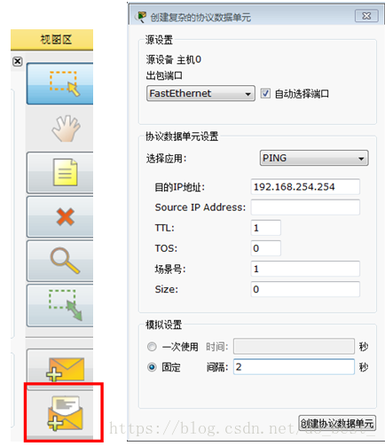 在 Destination IP Address:(目的 IP 地址:)字段中输入192.168.254.254。将 TTL: 字段中的值改为 1。在 Sequence Number(序列号)字段中输入 1。在 Simulation Settings(模拟设置)下选择 Periodic(定期)选项。在Interval(时间间隔)字段中输入 2。