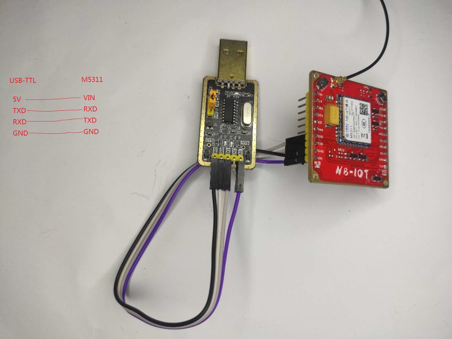 1.把USB转TTL串口模块和M5311模块用杜邦线连接起来