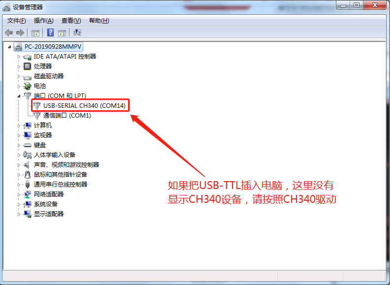 如果在串口选择那里没有发现CH340设备,打开电脑设备管理器