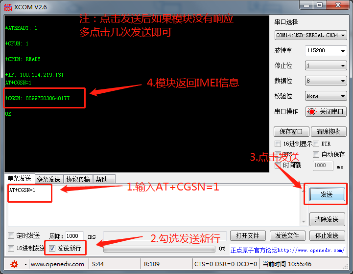 3.输入AT指令获取模块的IMEI和IMSI