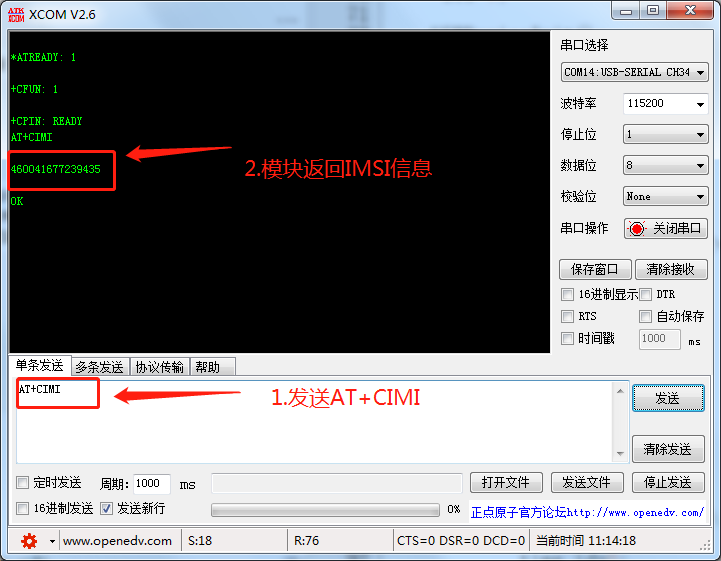 同理,发送AT指令获取IMSI: