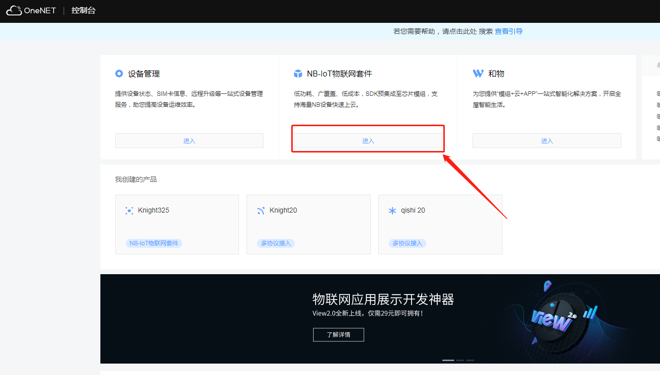 3.进入开发者中心后,点击进入NB-IoT物联网套件: