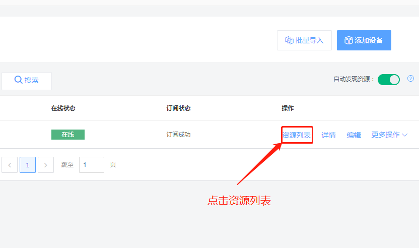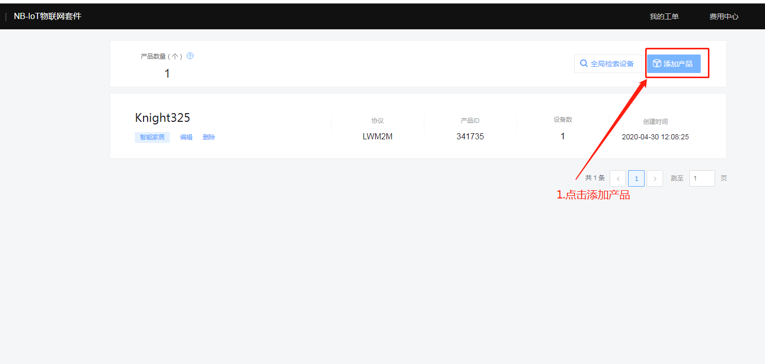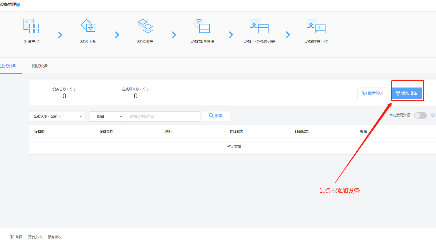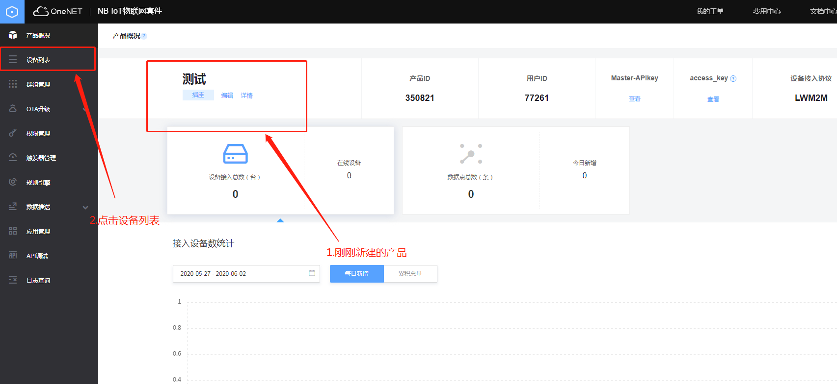 6.新建产品后,点击产品的名字进入下图页面后,点击左侧的设备列表