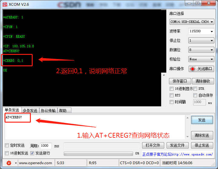 然后再输入框输入AT+CEREG?,用于查询M5311模块的网络状态: