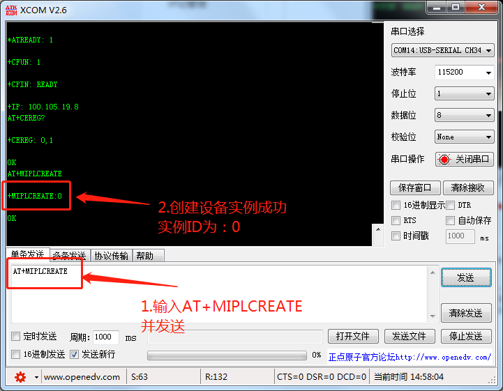 2.在输入框输入:AT+MIPLCREATE,并发送