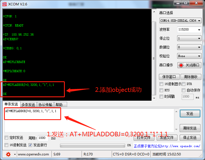 3.创建实例成功后,发送:AT+MIPLADDOBJ=0,3200,1,"1",1,1