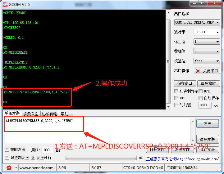 4.添加Object成功后,发送:AT+MIPLDISCOVERRSP=0,3200,1,4,"5750"