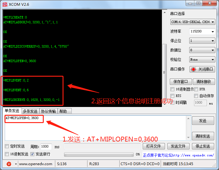发送:AT+MIPLOPEN=0,3600