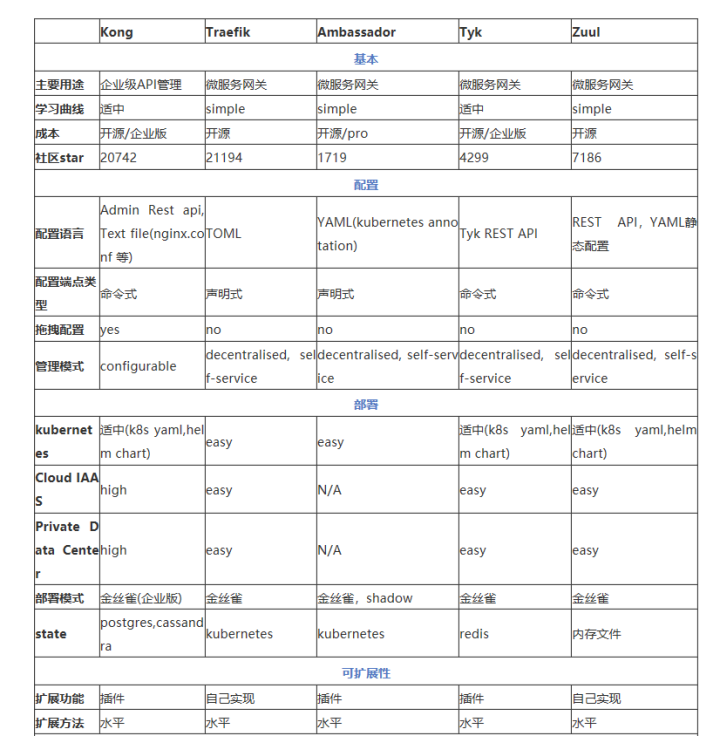 由上述对比表格中可以看出:从开源社区活跃度来看,无疑是Kong和Traefik较好;从成熟度来看,较好的是Kong、Tyk、Traefik;从性能角度来看,Kong要比其他几个领先一些;从架构优势的扩展性来看,Kong、Tyk有丰富的插件,Ambassador也有插件但不多,而Zuul是完全需要自研,但Zuul由于与Spring Cloud深度集成,使用度也很高,近年来Istio服务网格的流行,Ambassador因为能够和Istio无缝集成也是相当大的优势。