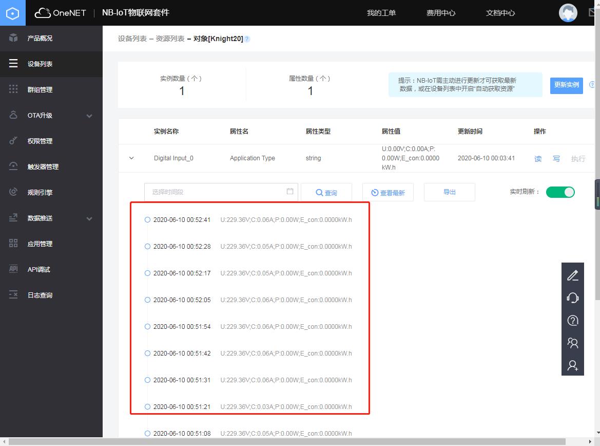 从Onenet也可以看到上传的电参数: