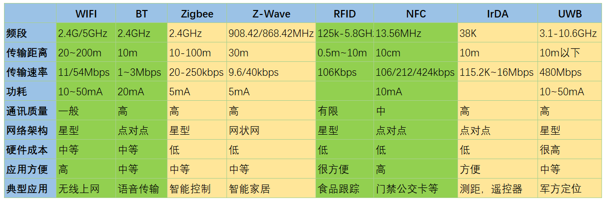WIFI 、BT 、Zigbee 、Z-wave、RFID、NFC、IrDA、UWB、LIFI等。