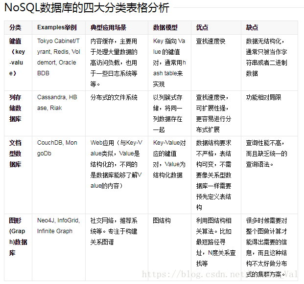 临时性键值存储(memcached、Redis)、永久性键值存储(ROMA、Redis)、面向文档的数据库(MongoDB、CouchDB)、面向列的数据库(Cassandra、HBase)
