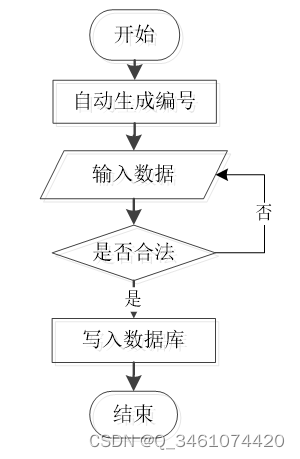 用户成功登入系统后就能够实现增加数据的操作,增加数据的编号是特定的,系统生成,用户不能随意填写,除了编号以外,其他增加信息用户自己填写,填写后的信息经过系统验证,验证合法通过就显示增加数据成功了,相反的话,就没有增加成功,图2-1显示的就是在增加数据时的流程。