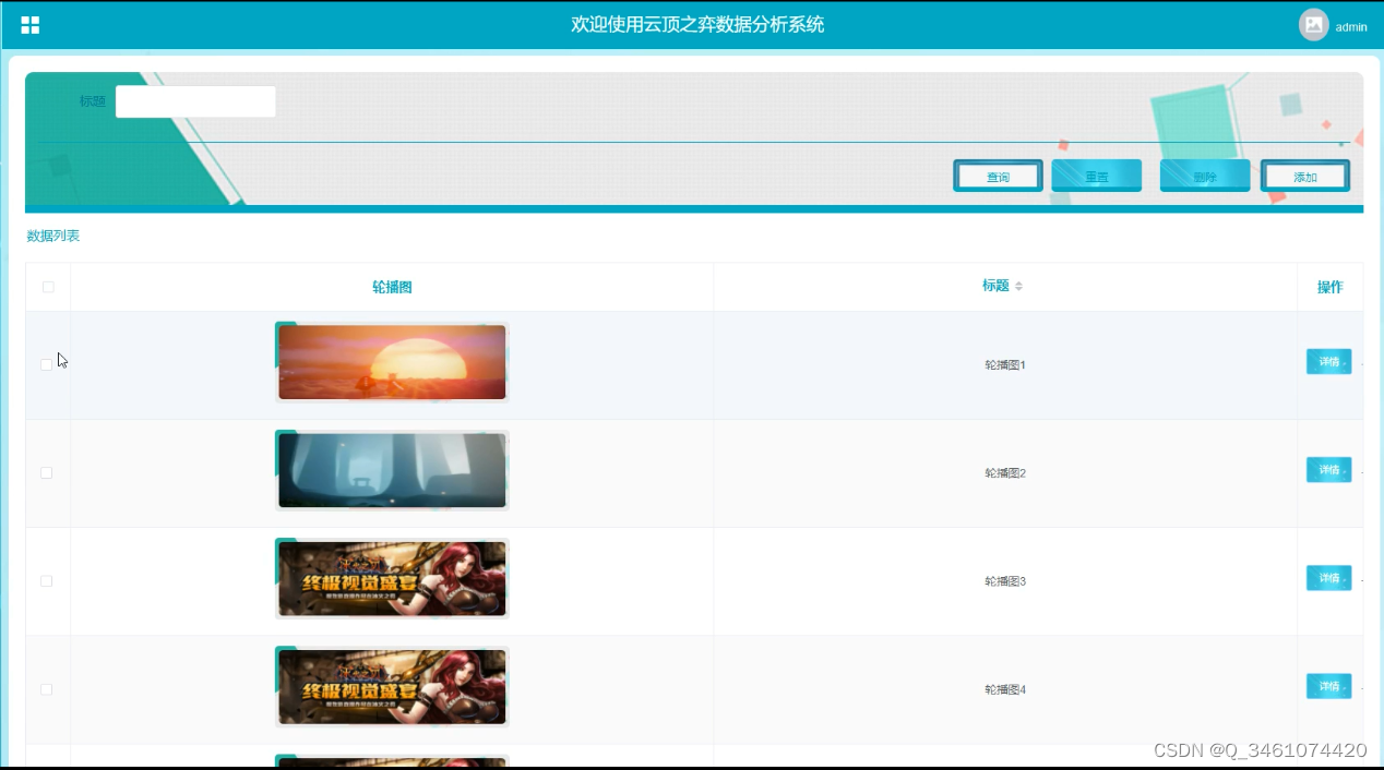 基于Python云顶之弈数据分析系统中的管理人员在“站点管理”这一菜单中是可以对前台显示的轮播图以及公告栏进行管控。界面如下图4-9所示。