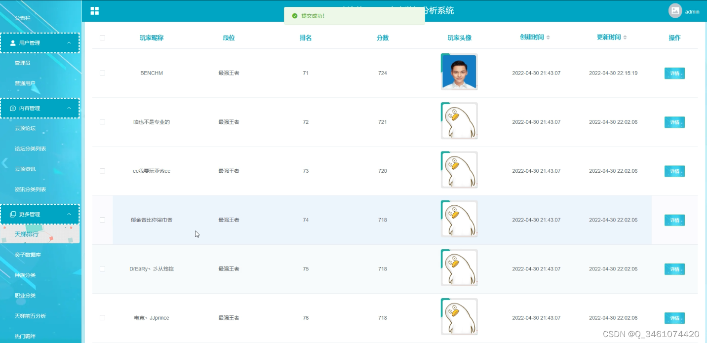 基于Python云顶之弈数据分析系统中的管理人员是可以对前台注册的用户进行管理的,也可以对管理员进行管控。界面如下图4-7所示。