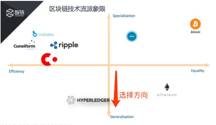 复杂度决定了对区块链平台通用性的需求,通用性反应在象限图上为,越靠上的平台专用性越强,越靠下的平台通用性越强。一般来说,越通用的平台系统也意味着系统开销越大、效率越低、开发门槛越高。因此我们需要根据业务的实际复杂情况选择最适合的通用性要求。