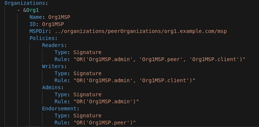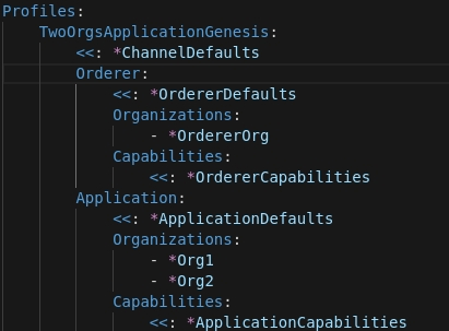 Organizations: 定义applicationchannel中包含的成员组织,如下图,包含Org1和Org2