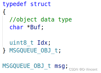 typedef struct { //object data type char *Buf; uint8_t Idx; } MSGQUEUE_OBJ_t; MSGQUEUE_OBJ_t msg; void Thread_MsgQueue1(void *argument) //发送消息线程 { (void)argument; //do some work... msg.Buf = "Hello BearPi-HM_Nano!"; msg.Idx = 0U; while (1) { osMessageQueuePut(mid_MsgQueue, &msg, 0U, 0U); //suspend thread osThreadYield(); osDelay(100); } }