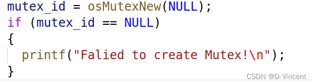 osMutexId_t mutex_id; //定义全局变量 mutex_id = osMutexNew(NULL); //创建一个新的互斥锁,并返回指向互斥锁对象标识符的指针 if (mutex_id == NULL) //做一个简单的判断,是否创建互斥锁成功 { printf("Falied to create Mutex!n"); }