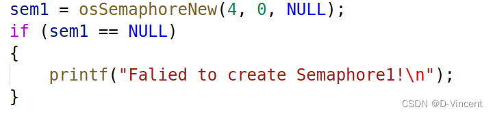 osSemaphoreId_t sem1; sem1 = osSemaphoreNew(4, 0, NULL); if (sem1 == NULL) { printf("Falied to create Semaphore1!n"); }