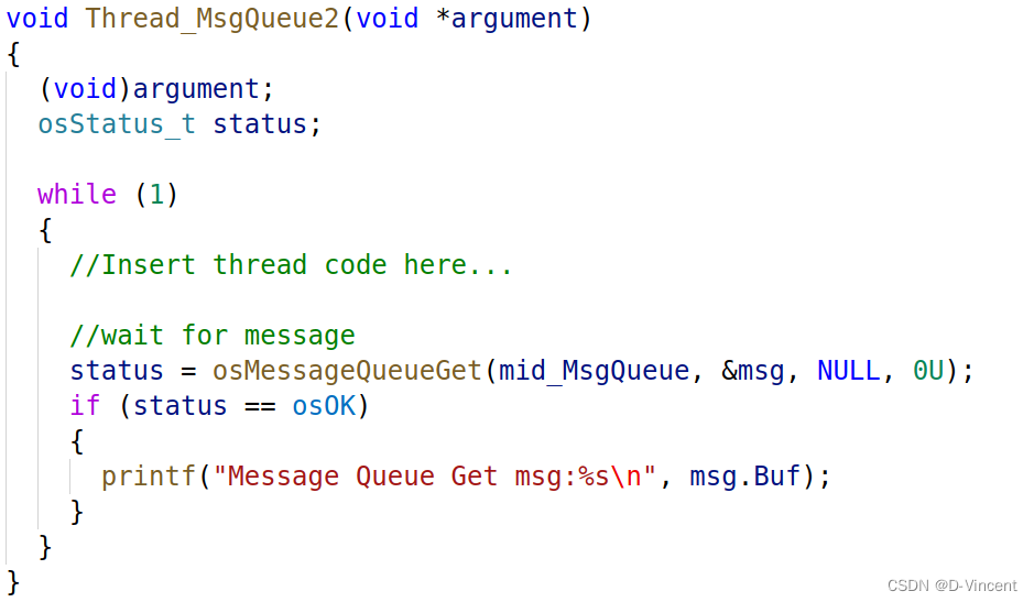 void Thread_MsgQueue2(void *argument) { (void)argument; osStatus_t status; while (1) { //Insert thread code here... //wait for message status = osMessageQueueGet(mid_MsgQueue, &msg, NULL, 0U); if (status == osOK) { printf("Message Queue Get msg:%sn", msg.Buf); } } }