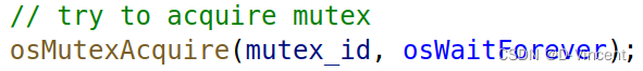 // try to acquire mutex osMutexAcquire(mutex_id, osWaitForever);