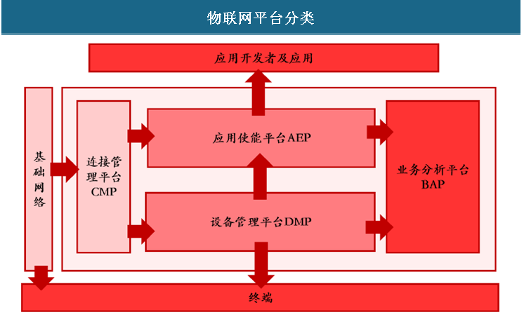 在物联网中,平台层也有类似的分层关系,但是按照逻辑关系由分为连接管理平台CMP(Connectivity Management Platform) 、 设备管理平台DMP(Device Management Platform) 、 应用使能平台AEP(Application Enablement Platform) 和业务分析平台BAP(Business Analytics Platform) 等四部分。