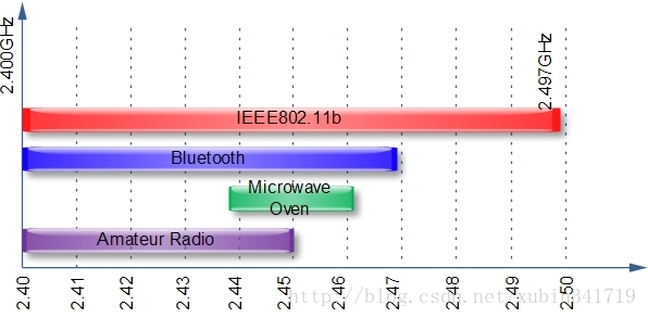 蓝牙工作在2.4GHz ISM频段上,蓝牙采用跳频扩谱技术主动的避免工作频段受干扰(微波炉的工作频率也是2.4GHz)。