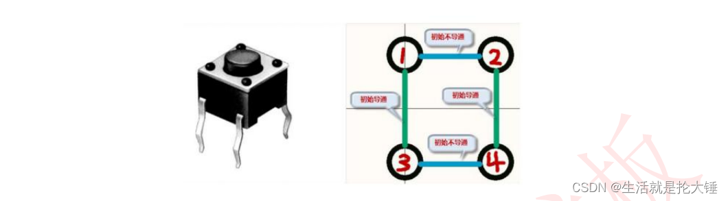 按键管脚两端距离长的表示默认是导通状态,距离短的默认是断开状态,如果按键按下,初始导通状态变为断开,初始断开状态变为导通。