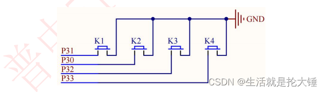 从上图中可以看出,4 个独立按键的控制管脚连接到 51 单片机的 P3.0-P3.3 脚上。其中 K1 连接在 P3.1 上,K2 连接在 P3.0 上,K3 连接在 P3.2 上,K4 连接 在 P3.3 上。4 个按键另一端全部连接在 GND,当按键按下后,对应 IO 口即为低 电平。