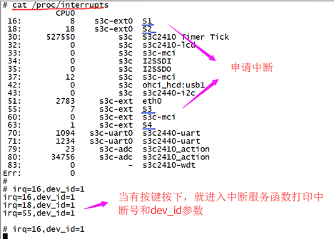 /* IRQ_EINT0: 中断号, 定义在 asm/arch/irqs.h,被linux/irq.h调用 buttons_irq : 中断服务函数, IRQT_ BOTHEDGE: 双边沿中断, 定义在 asm/irq.h,被linux/irq.h调用 “S1”: 保存文件到/proc/interrupt/S1, 1: dev_id,中断函数的参数, 被用来释放中断服务函数,中断时并会传入中断服务函数 */ request_irq(IRQ_EINT0, buttons_irq,IRQT_BOTHEDGE, “S1”, 1); request_irq(IRQ_EINT2, buttons_irq,IRQT_ BOTHEDGE, “S2”, 1); request_irq(IRQ_EINT11, buttons_irq,IRQT_ BOTHEDGE, “S3”, 1); request_irq(IRQ_EINT19, buttons_irq,IRQT_ BOTHEDGE, “S4”, 1);