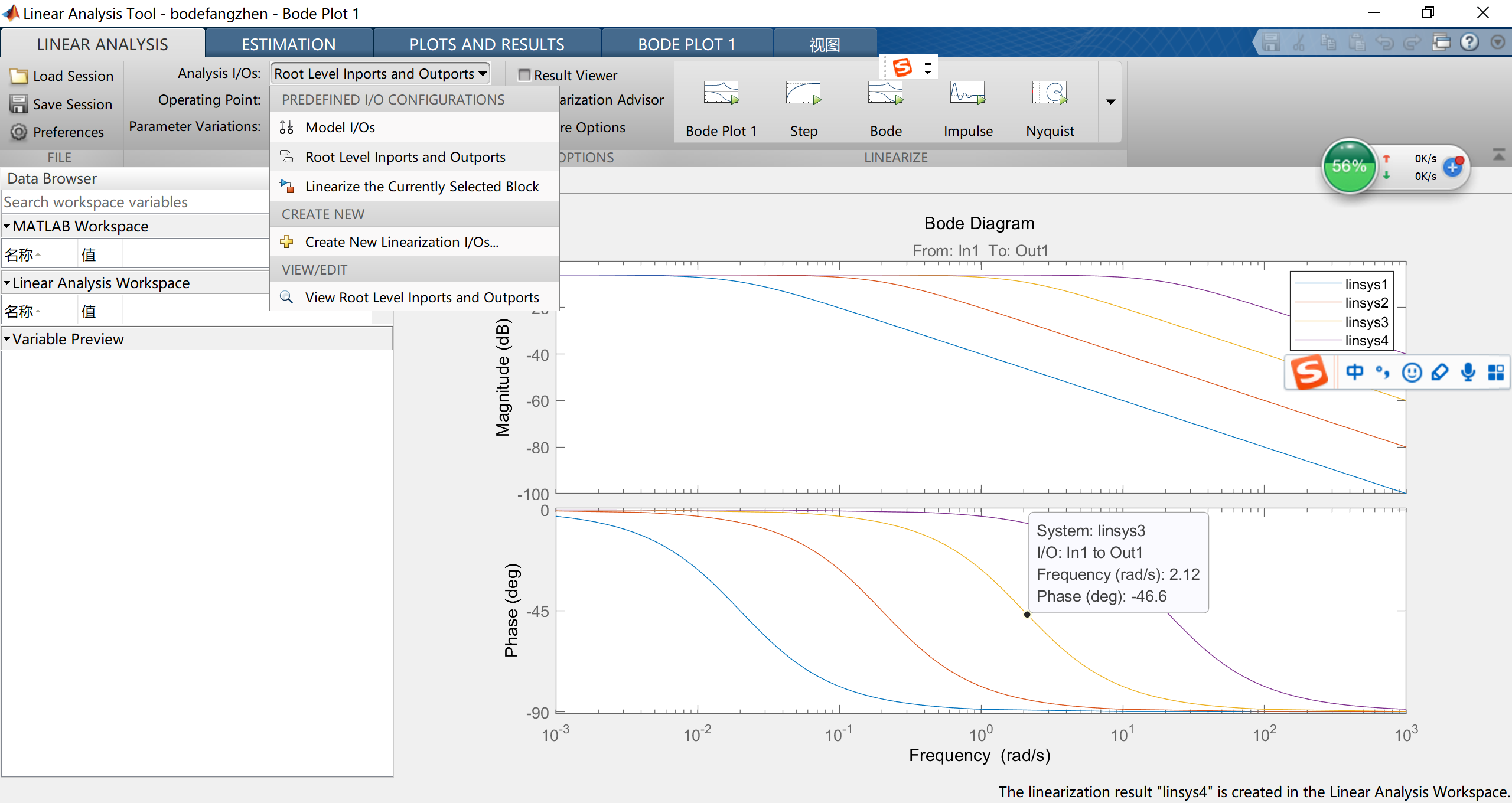 如上图为绘制的bode图,点击analysis下的control design,找到linear analysis,然后进入界面后将analysis I/O s设置为第二项。