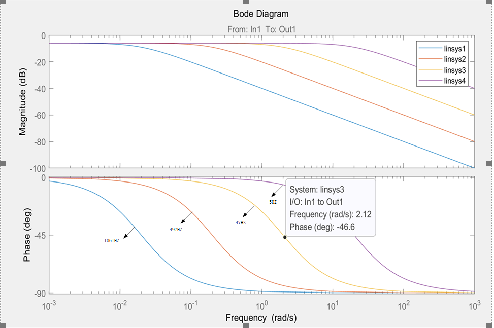 然后利用matlab/simulink可以绘制出四组数据的幅频特性曲线,绘制bode图为反应系统自身的相应特性,所以不考虑相应输入输出,用input和output将系统本身的输入输出分开。
