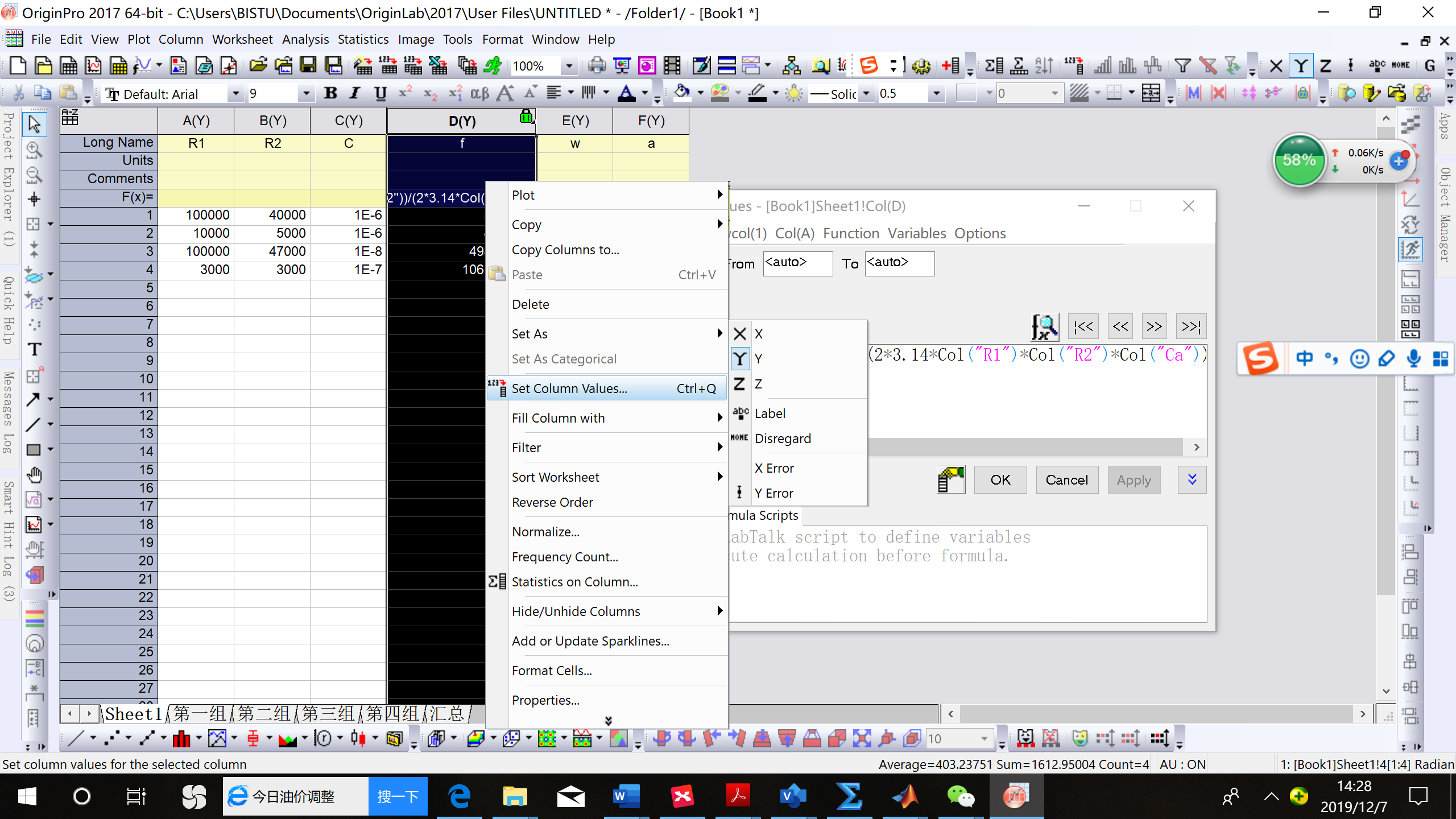 选中D(Y)列,右键选择 setcolumn value,然后就可以进行公式的编辑