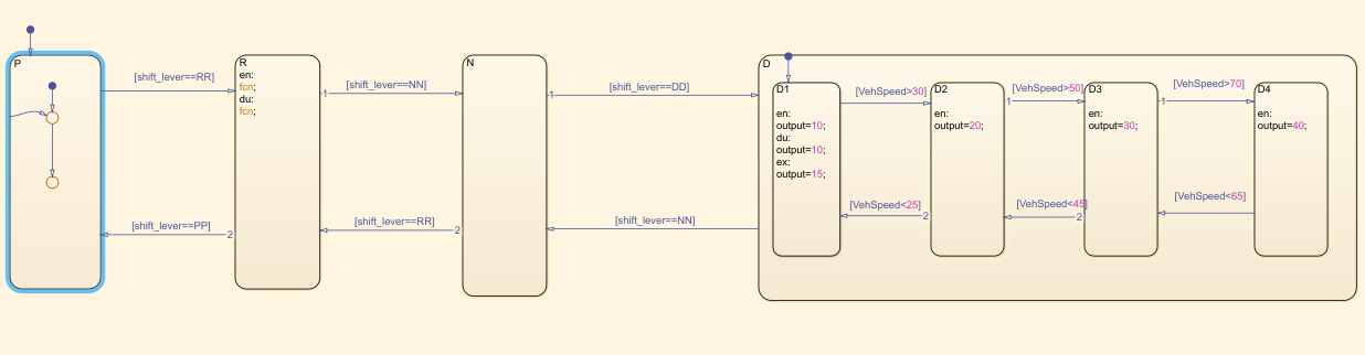下图为最终搭建好的模型,分为4个大状态,对应PRND四个挡位,其中D挡状态里面又嵌套了四个状态,代表自动挡的4个挡位,1挡、2挡、3挡、4挡。
