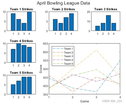 将 scores 和 strikes 定义为包含四场保龄球联赛数据的向量。然后创建一个分块图布局,并显示三个图块,分别显示每个团队的击球数量。