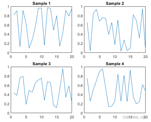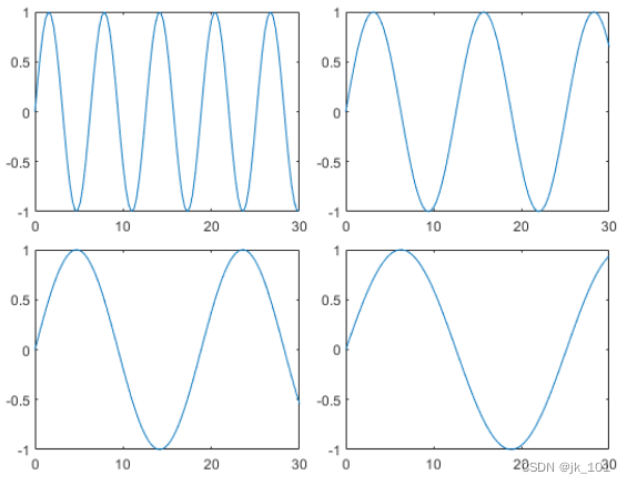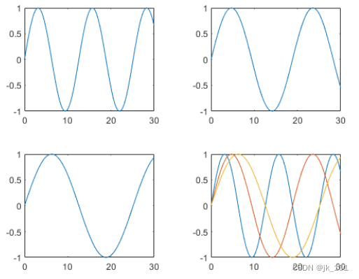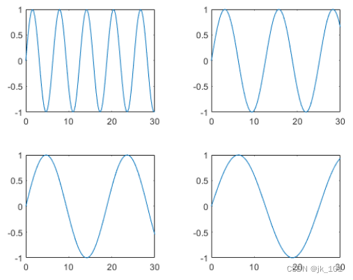 创建五个坐标向量:x、y1、y2、y3 和 y4。然后调用 tiledlayout 函数来创建 2×2 布局,并指定返回参数来存储 TileChartLayout 对象。在调用 plot 函数之前,调用 nexttile 函数以在下一个空图块中创建坐标区对象。