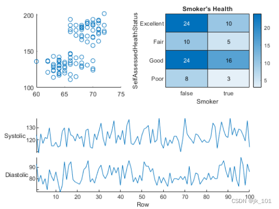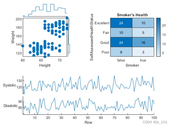加载 patients 数据集,并基于变量子集创建一个表。然后创建一个 2×2 分块图布局。在第一个图块中显示散点图,在第二个图块中显示热图,并显示跨底部两个图块的堆叠图。