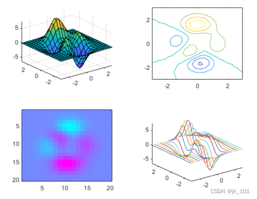 创建一个 2×2 分块图布局,并调用 peaks 函数以获取预定义曲面的坐标。通过调用 nexttile 函数,在第一个图块中创建一个坐标区对象。然后调用 surf 函数以在坐标区中绘图。对其他三个图块使用不同绘图函数重复该过程。