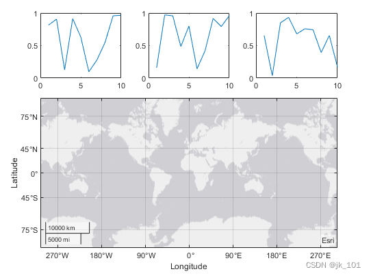 通过调用 geoaxes 函数创建一个地理坐标区对象 gax,并将 t 指定为 parent 参数。默认情况下,坐标区进入第一个图块,因此通过将 gax.Layout.Tile 设置为 4 将其移至第四个图块。通过将 gax.Layout.TileSpan 设置为 [2 3],使坐标区占据图块的 2×3 区域。