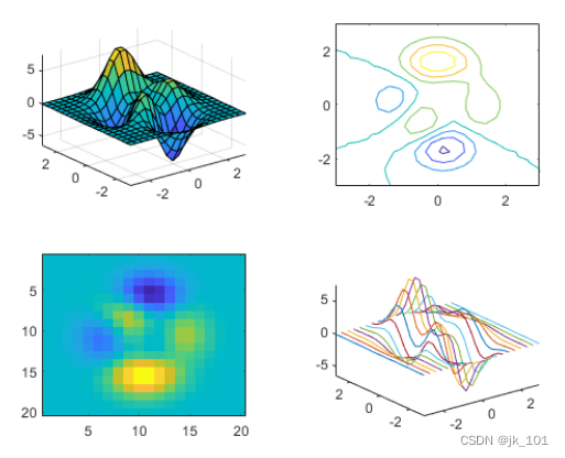 创建一个 2×2 分块图布局。调用 peaks 函数以获取预定义曲面的坐标。然后在每个图块中创建一个不同的曲面图。