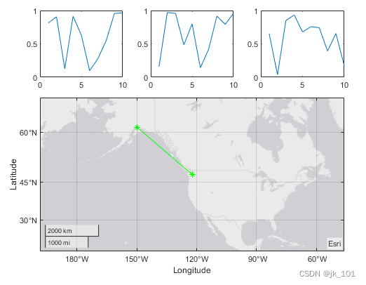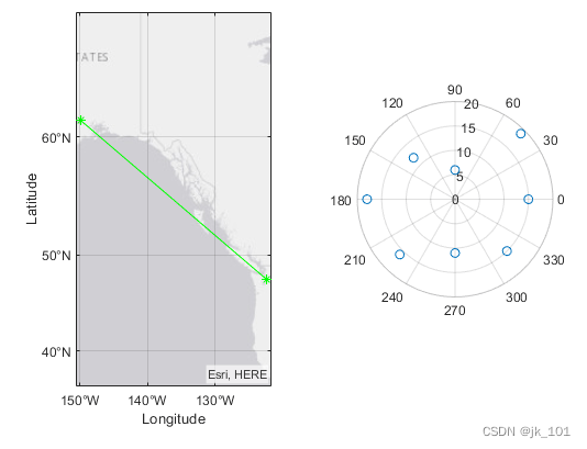 创建 1×2 分块图布局。在第一个图块中,显示包含连接地图上两个城市的线的地理图。在第二个图块中,在极坐标中创建一个散点图。