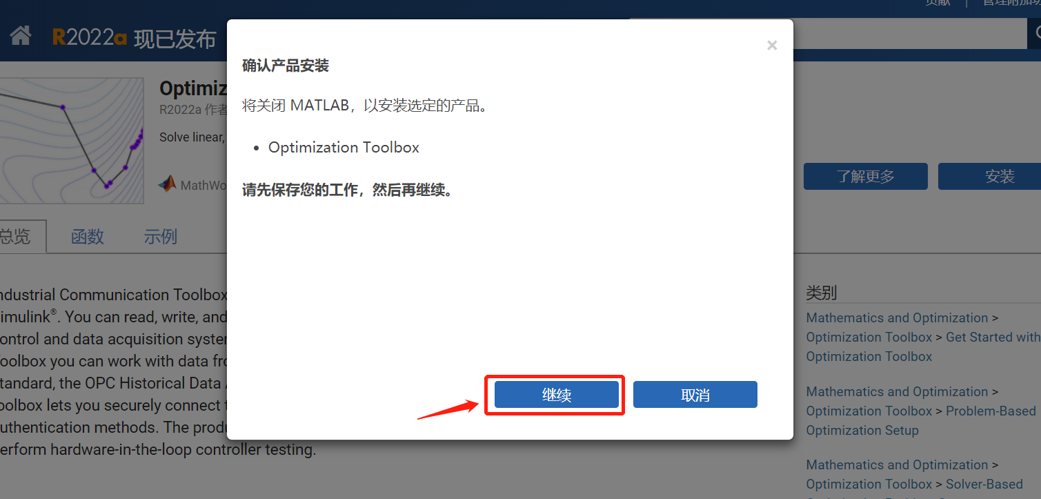 点击“继续”之前,记得保存你的代码!安装过程会重启Matlab