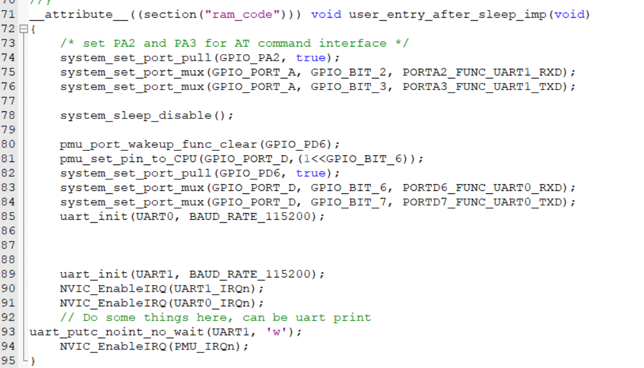 3,每次发数据前先发一包数据唤醒,第二包数据串口能收到,处理完用户程序在调用睡眠system_sleep_enable();