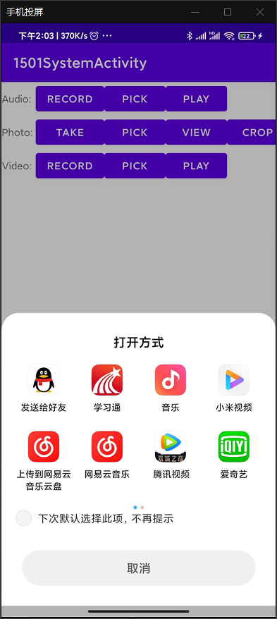 调用后,如果系统中有多个可以播放音频的应用,则会弹出一个选择界面,选择其中一个应用(比如“音乐”)后,就会用该应用播放音频。