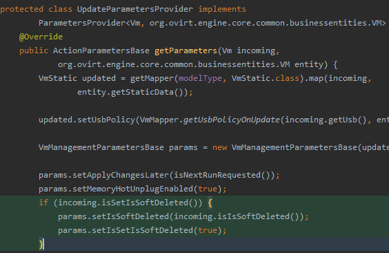 到了后端,修改更新命令函数:org.ovirt.engine.core.bll.UpdateVmCommand#executeVmCommand,对应的dal下的数据库接口和实现添加updateVmSoftDeleted方法,最后添加sql function。