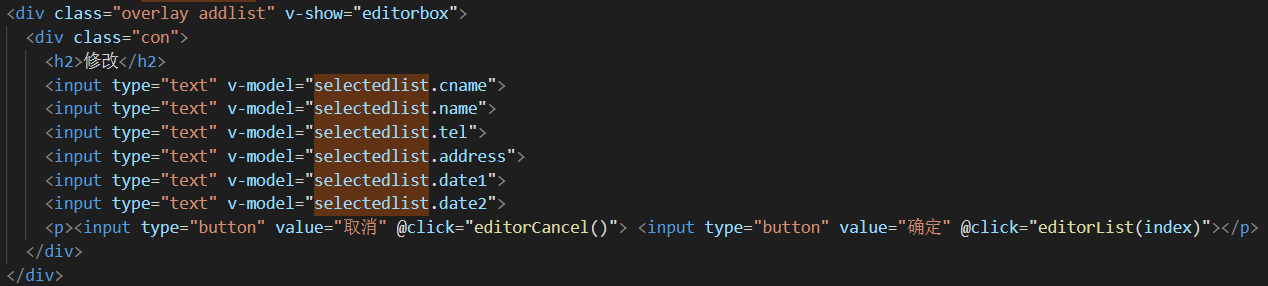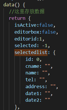 this.selectedlist = {id: 0,cname: "",name: "",tel: "",address: "",date1: "",date2: ""};