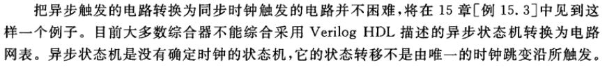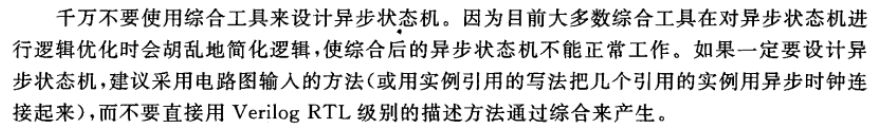 目前大多数综合器不能综合采用Verilog HDL描述的异步状态机。异步状态机是没有确定时钟的状态机,它的状态转移不是由唯一的时钟跳变沿所触发。