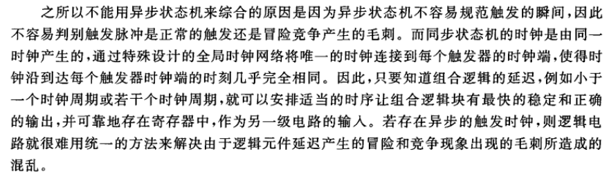异步状态机:异步状态机没有确定的时钟,它的状态转移不是由唯一的时钟跳变沿所触发。